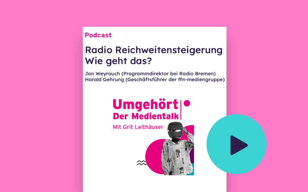 In dieser Folge von Umgehört – der Medientalk dreht sich alles um die Frage: Wie steigert man die Reichweite eines Radiosenders? Gastgeberin Grit Leithäuser spricht mit Jan Weyrauch (Programmdirektor bei Radio Bremen) und Harald Gehrung (Geschäftsführer der ffn-mediengruppe) darüber, wie sie es geschafft haben ihre Hörerzahlen auszubauen. Im Gespräch geht es um Erfolgsstrategien, den Mut […]